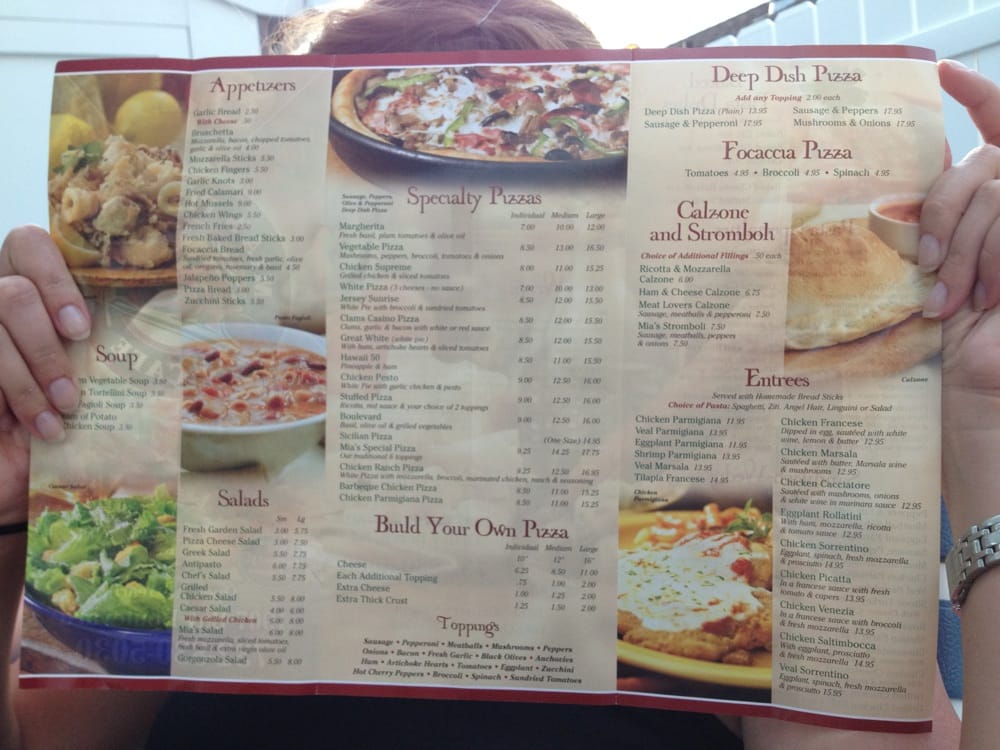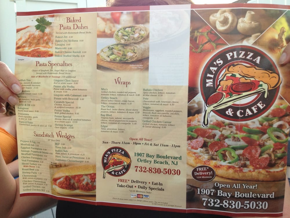 Introducing the menu at Mia's Pizza and Cafe, a casual yet classy Italian eatery in Ortley Beach, NJ. Known for offering the best pizza in Seaside, Mia's caters to all dietary needs with many vegetarian and gluten-free options. Customers rave about the delicious seafood pasta dishes and thin-crust pizzas topped with just the right amount of cheese. The Margarita pie and mozzarella sticks are must-tries, perfect for a quick takeout or a sit-down meal with the family. With friendly staff, fast service, and a bustling atmosphere, Mia's is a go-to spot for lunch or dinner near Lavallette. Make sure to order ahead as it can get busy on weekends. Experience the best of Italian cuisine at Mia's Pizza and Cafe.